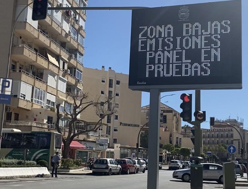 En la entrada de la calle Hoyo de Torremolinos hay instalada una pantalla donde aparece el siguiente mensaje: «Zona Bajas Emisiones. Panel en pruebas».